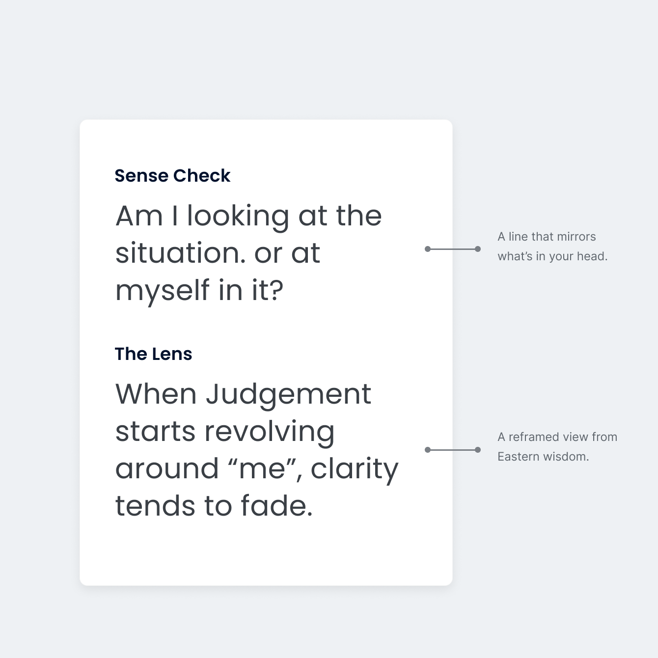To do this, we built The Lens. The Lens doesn’t ask users to explain their problem. Instead, it starts from their current state by choosing what feels closer: Harder, Off, or Unclear. In an age where AI can generate endless content, we invest most of our effort in defining real situations and correcting judgment bias. AI interpretation in The Lens is designed to clarify the situation — not to make decisions on the user’s behalf.